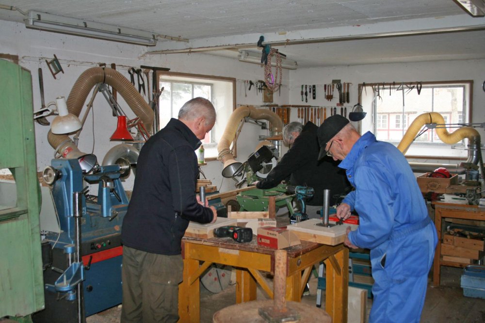Materialerne til hættemågekasserne - stålrør med påsvejset plade, birk krydsfiner som bund og lister i lærk - skulle samles. Og det blev de på redkordtid! Der var afsat tid fra klokken 9 til klokken 14. Som under arbejdsdagen med rensning af redekasser i reservatet viste det sig hurtigt, at tre af de fremmødte kunne noget helt særligt i f. m. samarbejde. Hans Ole kom under arbejdet med en kommentar om, at det jo næsten var som et samlebånd.