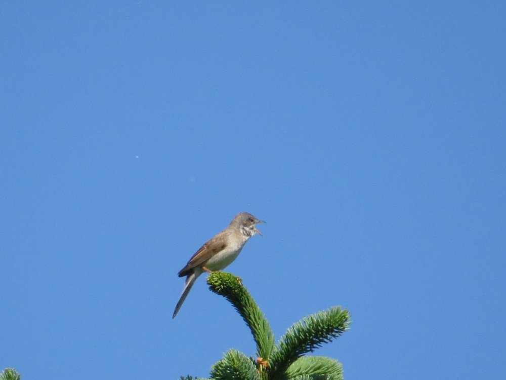 Ved Tårnfalkehøjen viste sig en en helt anden flora, der knytter sig mere til den tørre bund. Her var mange forskellige urter, som Inge kunne snakke om og demonstrere forskellene på. Der var Slangehoved og både Uldhåret og Mørk Kongelys samt Mark-Krageklo.Tre falkeunger kiggede ud fra kassen i masten og en musvåge kom forbi. Derudover var der en tornsanger (foto) et par rødben, mange hættemåger, viber, gæs, blishøns og en enkelt gråstrubet lappedykker at se og høre.